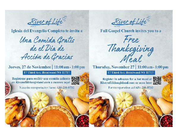 Join us for a free, Thanksgiving Meal from 11 am to 1 pm! We will have warm food to eat in-house as well as clothes to distribute and additional warm food to bring home. God bless you! River of Life 17 Third Ave Brentwood, NY 11717